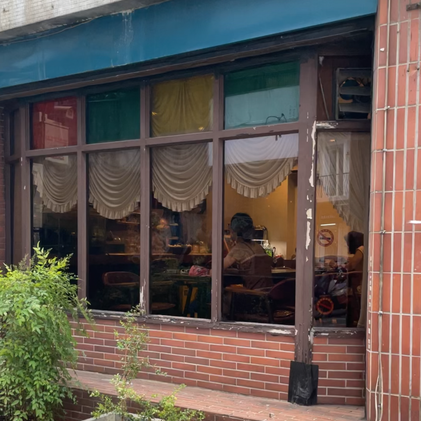 優の珈琲的空間仍保留濃厚的老派韻味。店內以木質傢俱與斑駁桌椅構成,兩面大落地窗讓午後陽光映照進來,懷舊的窗簾、泛黃的玻璃紙與安靜的氛圍,讓人彷彿回到 1970、80 年代的喫茶館時光。