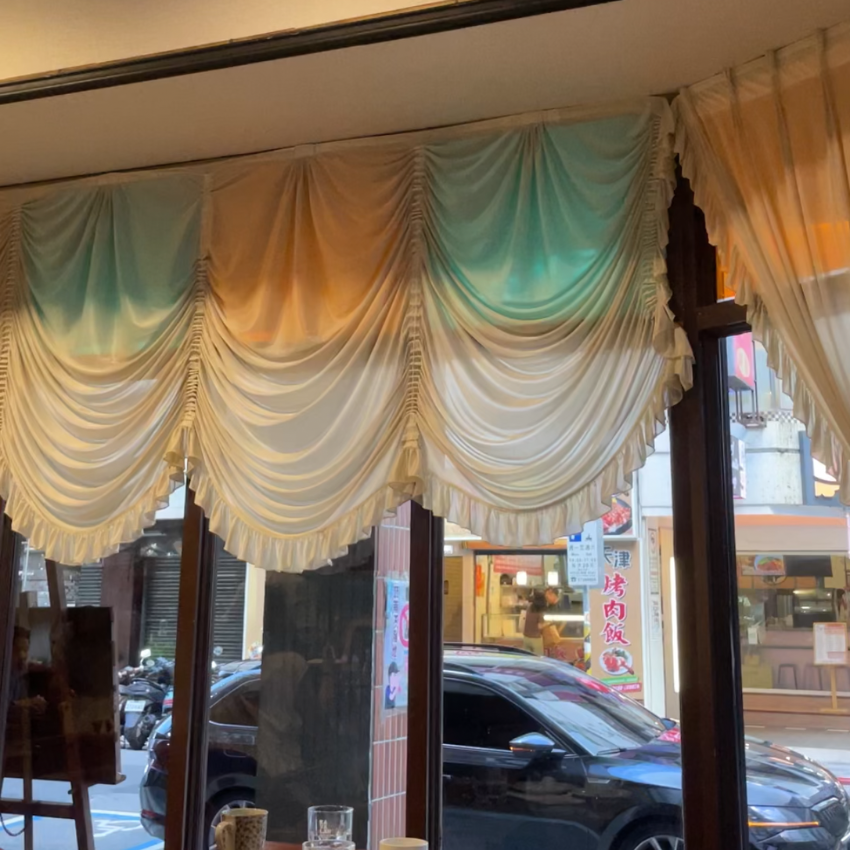 優の珈琲的空間仍保留濃厚的老派韻味。店內以木質傢俱與斑駁桌椅構成,兩面大落地窗讓午後陽光映照進來,懷舊的窗簾、泛黃的玻璃紙與安靜的氛圍,讓人彷彿回到 1970、80 年代的喫茶館時光。