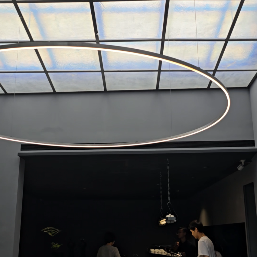 空間設計無疑是引路咖啡旗艦店最大的亮點之一。建築體保留了大溪老透天厝典型的狹長格局,內部設計大量運用無彩色系的水泥灰牆與冷調金屬,構築出極具現代感的工業美學。視覺核心聚焦於後方巨大的 U 型不鏽鋼吧台,其俐落線條與其後的玻璃隔間烘豆室相互呼應,將 Probat 烘豆機與生豆麻布袋轉化為空間中的展示藝術。此外,設計師巧妙地利用天井引入自然光,使原本深邃的空間在日間能隨著光影變化,展現出不同於夜晚的溫潤層次。
