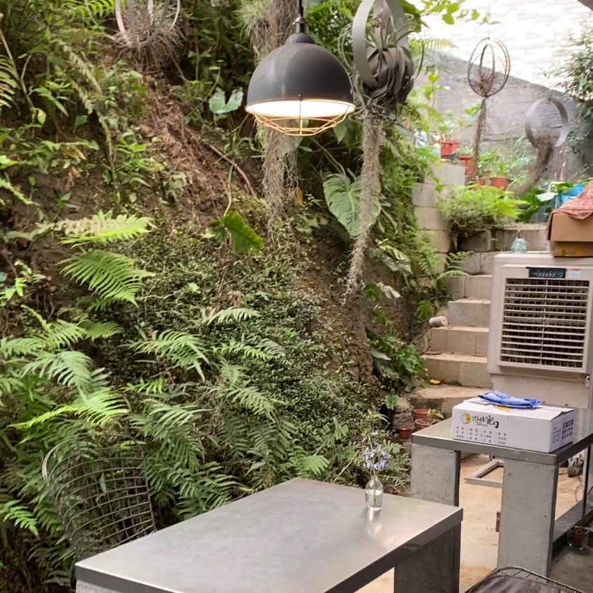 推開大門後,清水模牆面搭配紅磚吧檯,讓工業風中帶著一絲老宅感。大片玻璃窗迎入自然光,視線正好落在岩壁上,宛如坐在一幅巨大的山水畫前。半戶外區則延伸出露營般的氛圍,木地板與綠植交織,像是山中小庭院,既能享受陽光,也能感受微風吹拂。店裡的植栽牆與一排排玻璃瓶中栽種的植物,則營造出森林般的清新感。