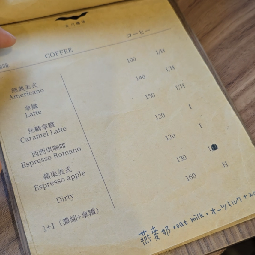 在飲品結構上,北川咖啡以自家烘焙的單品咖啡與創意義式特調為核心。單品咖啡的體驗極具儀式感:店家會將一壺手沖咖啡分別倒入兩種不同杯型(厚壁與薄壁)的玻璃杯中,讓顧客能品嘗到同一款咖啡在不同器具作用下所呈現出的香氣與醇厚度的差異。在義式特調方面,蘋果美式($130 NT)是常被提及的特色飲品。