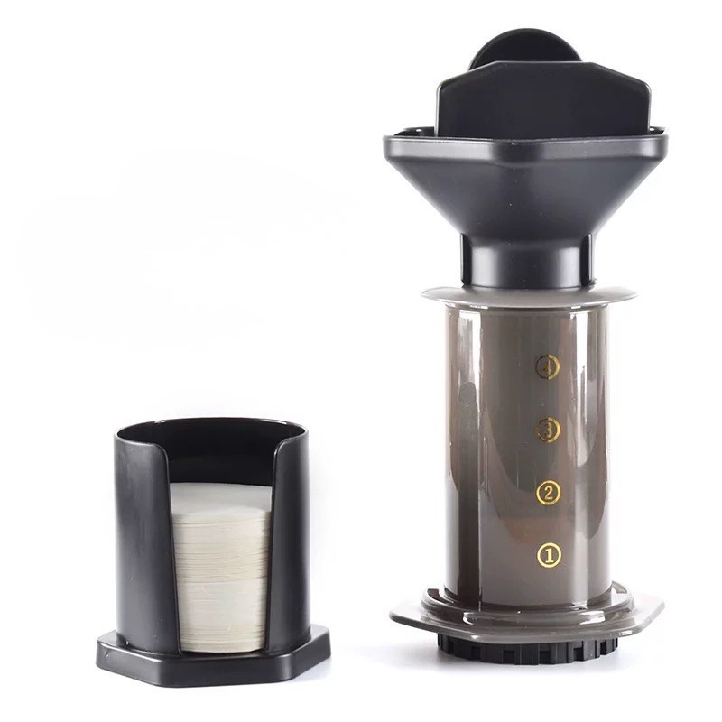 商品構造簡單,如同大針筒的造型, 利用筒內的空氣推擠,讓熱水通過筒內咖啡粉,藉此萃取出咖啡液, 萃取度比手沖更高。